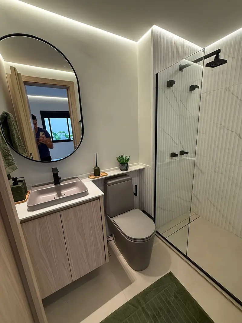 - Porcelanato no piso e paredes do box